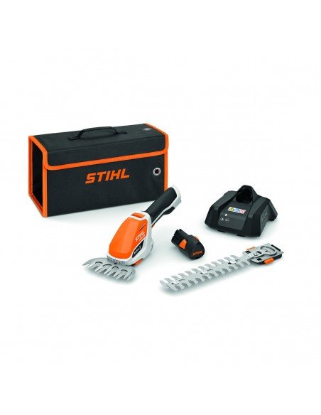 - Rinkinį sudaro: 1 x ličio jonų akumuliatorius AS 2, 28 Wh, 10,8 V 1 x standartinis įkroviklis AL 1 1 x krūmynų peilis, pjovimo ilgis – 20 cm, įsk. peilio apsaugą 1 x žolės peilis, pjovimo plotis – 12 cm, įsk. peilio apsaugą 1 x juodas / oranžinis gabenimo krepšys su tvirtinimui prie sienos skirtomis ąselėmis;